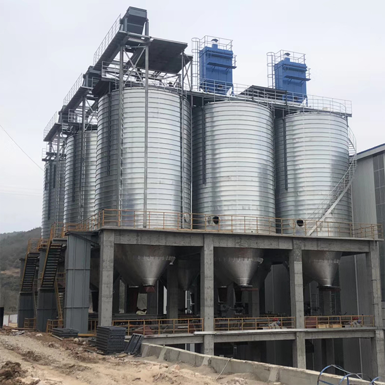 接收与清理设置在筒仓中央该形式筒仓一般采用对称排列,提升机井架固定,经过提升后的物料通过仓顶溜管进人筒仓。这种形式省去了仓顶输送设备和上通廊,从而节省了建造费用,缩短了建造工期。对于贮存时间要求较长的大型粮库,则应根据物料的流向、场地情况、工艺要求等合理地配置投料口、工作塔、烘干塔及渭南钢板仓的位置。国华钢板仓介绍了这几种常见的进料形式,实际中可将各种形式相互组合,相互渗透,根据实际情况合理搭配,灵活选用。